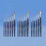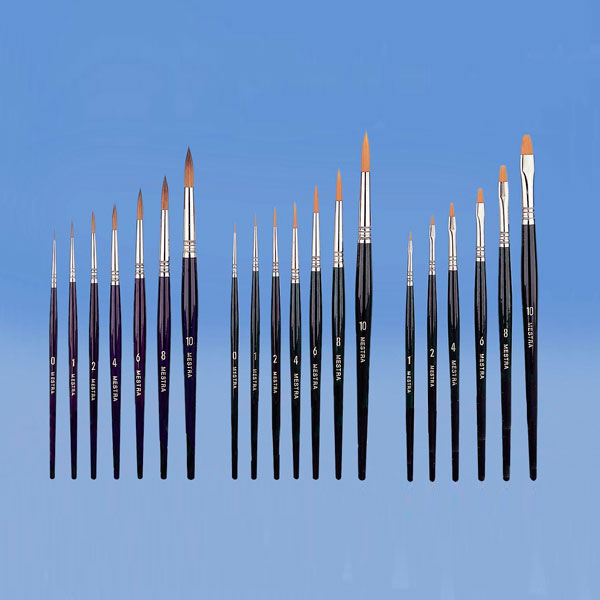 Pinceles de alta calidad disponibles en tres variedades: redondos en punta con pelo de Marta Kolinski, redondos en punta con fibra Toray Oro, y pincel plano de fibra Toray Oro. Mango de madera noble esmaltada, y virola de latón niquelado.