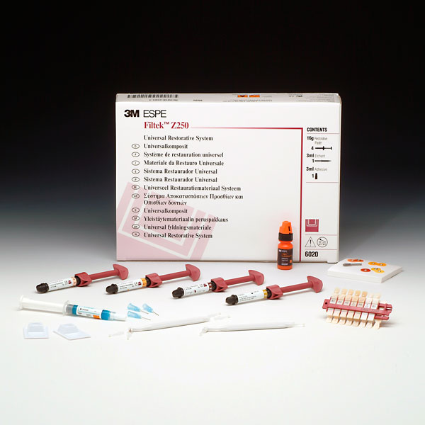 Sistema Restaurador Universal filtek Z250:Restauraciones directas anteriores y posteriores.Restauraciones indirectas: inlays, onlays y carillas.Técnica de sándwich.Reconstrucción de muñones.Reconstrucción de cúspides.ferulización.Estuche de introducción:4 jeringas de 4g en los tonos A2, A3,5, A4 y B3, 1 botellita adhesivo Scotchbond 1 XT de 3 ml, 1 jeringa grabador Scotchbond 3ml, accesorios, guía de color, discos de pulido Sof-Lex Pop-On XT.