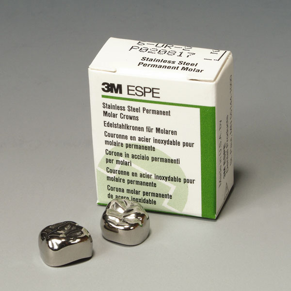 Coronas temporales en acero inoxidable. Diseñadas para reproducir fielmente los molares primarios y los primeros molares permanentes, en una amplia gama de tamaños. Su forma anatómica no precisa ningún tipo de ajuste y están dobladas hacia dentro, en el margen cervical. Estas coronas tienen recomendado su uso en odontopedriatría como mantenedores de espacio, o como alternativa al composite y a la amalgama en pacientes odontopediátricos. Pueden usarse en casos de larga duración en adultos.5 unidades.