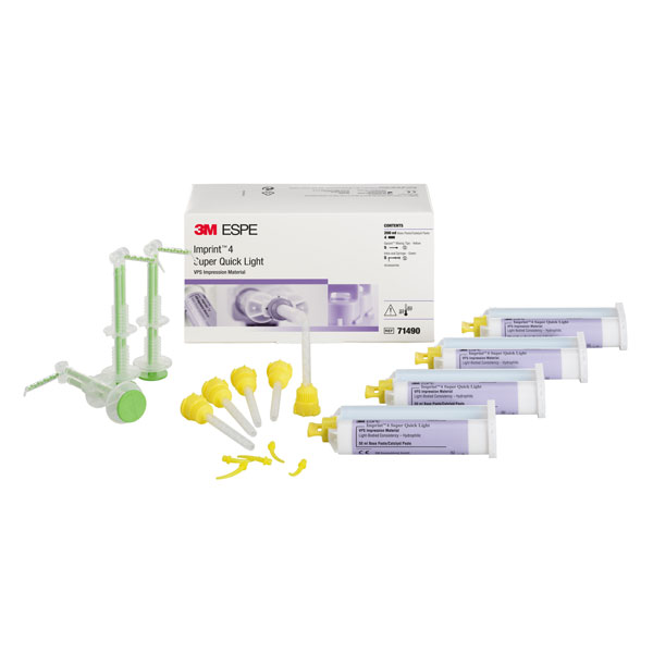 Reposición Imprint 4 Super Quick Light.4 cartuchos Imprint 4 Super Quick Light de 50 ml, 5 puntas de mezcla Garant amarillas, 5 jeringas intraorales 3M ESPE verdes.