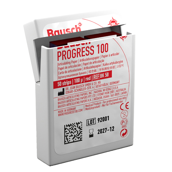 Papel de articular de coloración progresiva PROGRESS 100 de 100 micras. Este papel suave, reforzado con fibras y con alta capacidadde almacenamiento cromático, se adapta exactamente a las superficies oclusales.Con su coloración progresiva, marca con precisión los puntos de los contactos oclusales.Gracias a la combinación única con el adhesivo Transculase® y un papel fino, se muestran con precisión los contactos y las superficies oclusales sobre superficies pulidas a alto brillo, la sustancia dentaria natural, las aleaciones metálicas o los materiales cerámicos.50 tiras, color rojo. Tamaño 5,2×2 cm.