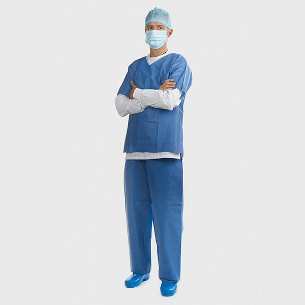 Conjunto quirúrgico de manga corta compuesto por casaca y pantalón. Realizado en microfibra SMS: ligera, hidrorepelente y altamente transpirable. Producto no estéril.Material: microfibra SMS 35 gr.Color: celeste.Talla L. 20 unidades.