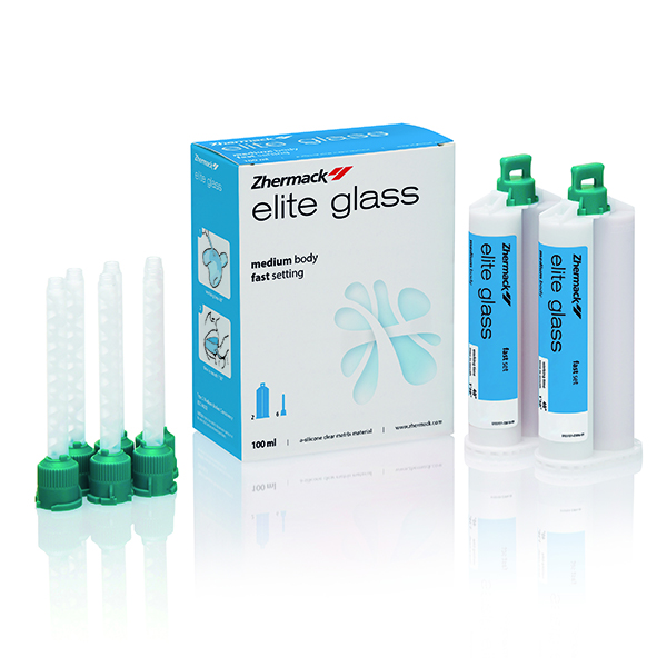Silicona de adición para matrices transparentes.Paquete estándar: 2 cartuchos x 50 ml + 6 puntas mezcladoras verdes.