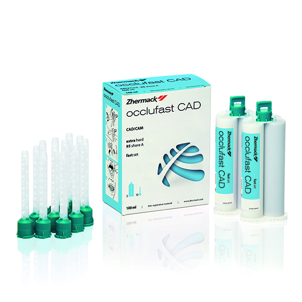 Silicona de adición para registros oclusales.Paquete estándar: 2 cartuchos x 50 ml + 12 puntas mezcladoras verdes